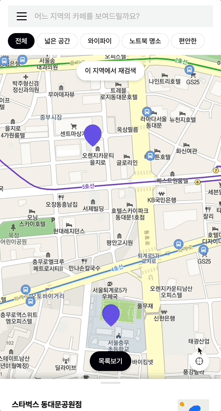 그래서 초기 렌더링 시에는 디폴트 위치로 이동하고, 우측 하단 버튼을 누르면 현재 위치로 이동하도록 구현했다.