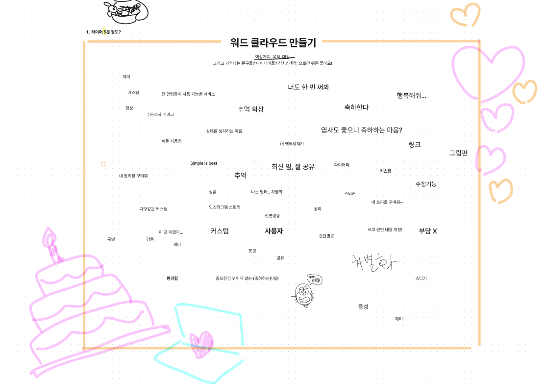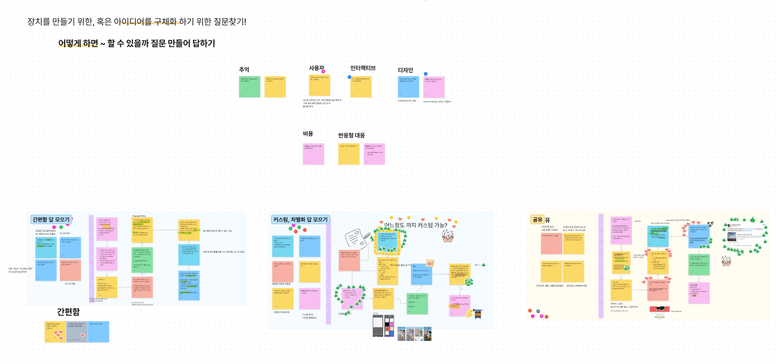 이렇게 우리 모두의 생각을 꺼내보고 공유하면서 여러 아이디어가 나왔다. 만약 먼저 결정이 뭔가 이루어졌다면 아이디어가 많이 나오지 않았을 것 같다.